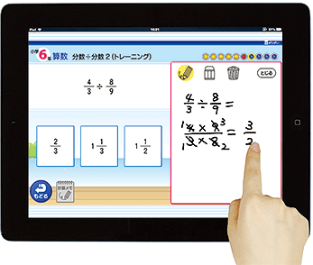 算数の計算問題などにはメモ機能がついており、式を書きながら解くことができます。