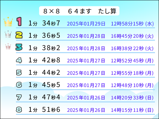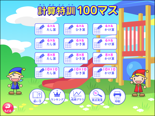 4×4・6×6・8×8・10×10マスの、たし算・わり算・かけ算をそれぞれ選択可能。問題の数字はランダムに入れ替わるので、反復練習や小テストなどに、くり返しご利用いただけます。